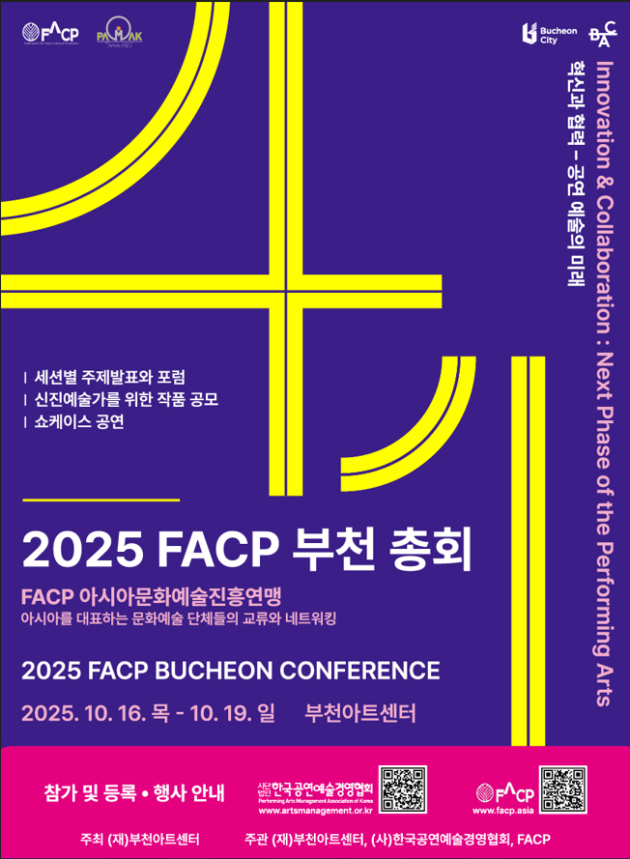 아시아를 대표하는 문화예술단체들의 교류와 네트워킹 FACP 아시아문화예술진흥연맹 2025 FACP 부천 총회 2025년 10월 16일(목)~10월 19일(일) 부천아트센터 주최/주관/후원 등 주최 : (재)부천아트센터 주관 : (재)부천아트센터 (사)한국공연예술경영협회 FACP 내용 세션별 주제발표와 포럼 신진예술가를 위한 작품 공모 쇼케이스 공연 참가비 참가방법 ‘참가신청’ 버튼 클릭해 참가신청 후 비용 결제 KB국민은행 293801-01-208929 (사)한국공연예술경영협회 (카드결제를 원하는 분은 010-9605-6180 으로 문자주시면, 결제가능한…