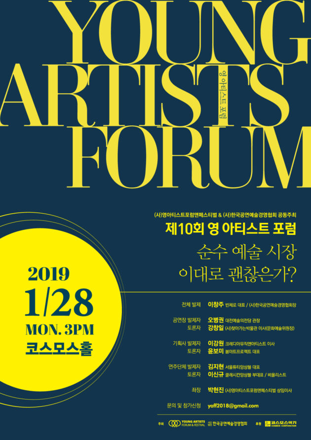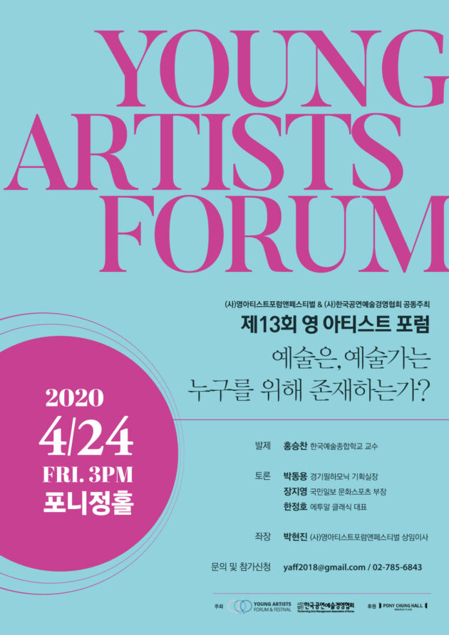 제13회 영아티스트포럼 “예술은, 예술가는 누구를 위해 존재하는가?” 2020년 4월 24일(금) 오후 3시 포니정홀 주제/개요 (사)한국공연예술경영협회와 (사)영아티스트포럼앤페스티벌의 두번째 공동주최 포럼이 열린다. 출연 발제: 홍승찬(한국예술종합학교 교수) 토론: 박동용(경기필하모닉 기획실장), 장지영(국민일보 문화스포츠 부장), 한정호(에투알 클래식 대표) 좌장: 박현진 (사)영아티스트포럼앤페스티벌 상임이사 주최/주관/후원 등 주최: (사)한국공연예술경영협회 / (사)영아티스트포럼앤페스티벌 후원: 포니정홀 참가방법 선착순 신청자에 한해 참가 (온라인 및 전화신청) 문의 02)780-5058…